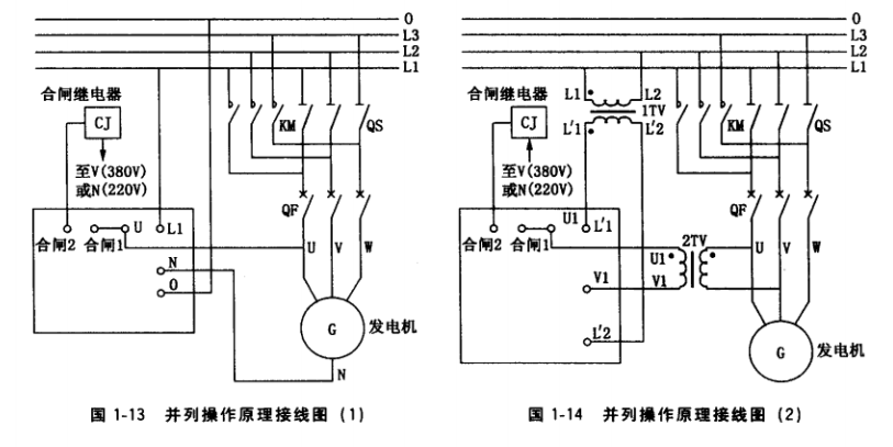 ① 斷開隔離開關QS,合上空氣開關QF (對于無QS直接用QF的,則應斷開QF),然 后起動待并機組,調(diào)節(jié)其轉(zhuǎn)速和電壓,通過頻率表、電壓表、同步指示儀檢測,確認上述4 個條件與主機相同時,迅速合閘,交流接觸器KM接通,然后合上QS, KM斷開,完成并 列投人操作。合上該機負荷開關,投人并列帶載運行。