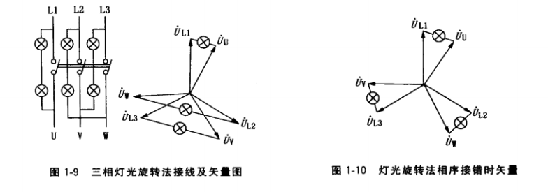 ② 燈光旋轉(zhuǎn)法。圖1-9是燈光旋轉(zhuǎn)法并列接線。當相序一致時,待并發(fā)電機和系統(tǒng)電壓 向量間的關系如圖所示。從圖中可看出,在任何時間3組燈的亮度不一樣,呈旋轉(zhuǎn)變化。當 發(fā)電機滿足同期條件時,加在L1、U間的電壓為零,加在L2、W和L3、V間的電壓均為線電壓,因此,接在L1、U間的燈泡熄滅,此時可將發(fā)電機并人系統(tǒng)。若待并發(fā)電機相序 接錯,如圖1-10所示,則3組燈光不是旋轉(zhuǎn)發(fā)光,而是同明同暗,此時不能將發(fā)電機并人 系統(tǒng)。