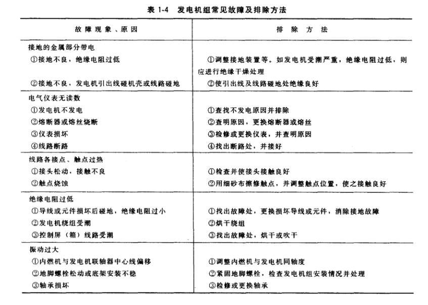 發(fā)電機組常見故障現(xiàn)象、原因及排除方法見表1-4。