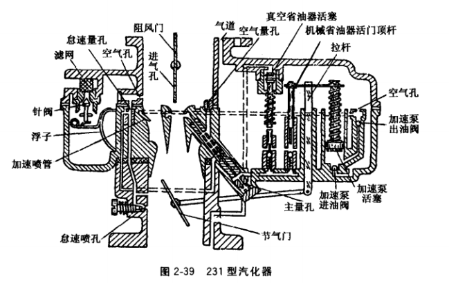 汽化器的形式很多,但其結(jié)構(gòu)及工作原理基本相同。下面以圖2-39所示的使用較廣泛的231逛汽化器為例,說明汽化器的調(diào)整和檢修。