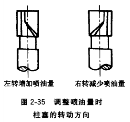 噴油量不均勻調(diào)整時(shí),可將調(diào)節(jié)齒桿移到停止供油的位罝。用小螺絲刀旋松調(diào)節(jié)齒輪上 的鎖緊螺釘?再用小螺絲刀頭觸在油雖控制套筒的小孔中,用小手錘輕輕地敲擊螺絲刀柄, 若噴油量過小,使控制套筒向左轉(zhuǎn)一定角度;噴油最過大,使控制套筒向右轉(zhuǎn)一定角度。轉(zhuǎn)動(dòng)控制套筒來調(diào)整噴油量大小時(shí).應(yīng)根據(jù)其構(gòu)造確定轉(zhuǎn)動(dòng)方向,如圖2-35所示。調(diào)整完成 后,再做試驗(yàn)進(jìn)行復(fù)驗(yàn),各缸噴油量應(yīng)接近一致為止。