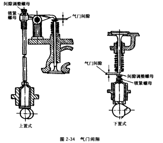 氣門間隙有上置式與下置式兩種,如圖2-34所示。氣門間隙通常是在冷機(jī)狀態(tài)下進(jìn)行檢查和調(diào)整的。柴油機(jī)、汽油機(jī)的氣門間隙在其使用說明書中均有規(guī)定。氣門間隙的檢查和調(diào)整方法如下: