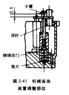 (4) 省油裝置的維修。231型汽化器裝有真空省油裝置和機(jī)械省油裝罝。真空省油裝置靠真空控制,可借活塞杠桿下端3道環(huán)梢加以調(diào)節(jié),如圖2-40所示。向下調(diào)節(jié)一個(gè)環(huán)槽,