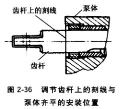 在裝配調(diào)節(jié)齒桿時(shí),齒桿上的刻線應(yīng)與泵體齊平,如 圖2-36所示。若向內(nèi)移入過多而看不到刻線,為最大油量過大;若向外移出過多,為最大油量過小,都必須進(jìn)行調(diào)整。