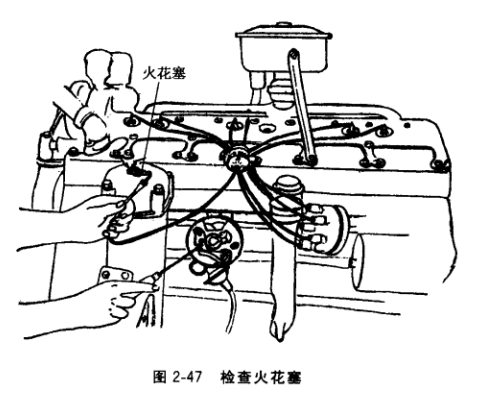 再用汽油洗凈,如積炭過(guò)多不易清理 時(shí),可用火烤一下,將電極間的積炭烤焦(溫度不可過(guò)高,以免損壞絕緣體)后清理。在檢査其絕緣體是否擊穿時(shí),可將清理完的火花塞放在氣缸蓋上,將分電器蓋打開(kāi),拔下蓋上的中央高壓線(xiàn),使之與火花塞鐵心接線(xiàn)處接觸,做跳火檢査,如圖2-47所 示,査看火花塞電極間的跳火情況。