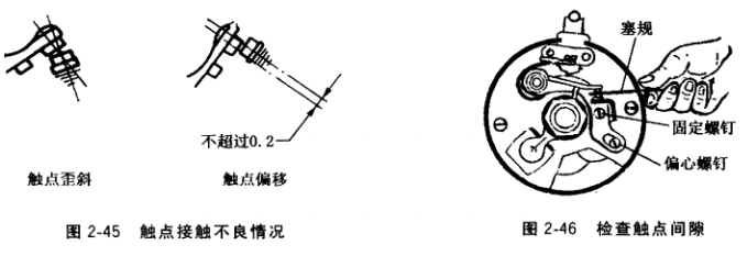 觸點(diǎn)修整后或換用新件裝復(fù)時(shí),上下觸點(diǎn)面的中心線(xiàn)不可歪斜,中心線(xiàn)偏移不得超過(guò) 0.2mm,如圖2-45所示。否則因接觸面過(guò)小而易燒蝕。活動(dòng)觸點(diǎn)臂的膠木襯套和頂塊如磨損或損壞,應(yīng)換新件。裝復(fù)時(shí),膠木襯套也應(yīng)點(diǎn)機(jī)油潤(rùn)滑。觸點(diǎn)臂的彈簧張力不足,可彎曲 彈簧片加以調(diào)整。