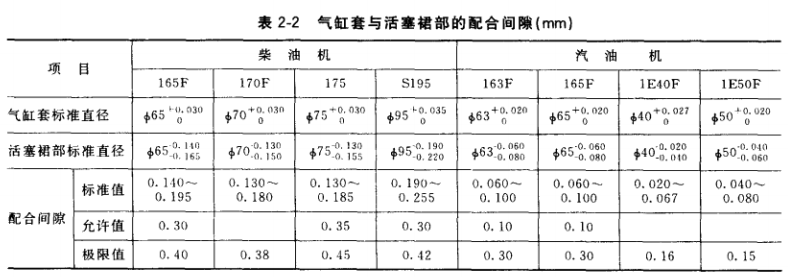 與活塞的配合間隙,此間隙在修理前后必須進(jìn)行檢測(cè)。沒(méi)有量具時(shí),可用塞規(guī)結(jié)合實(shí)際經(jīng)驗(yàn)進(jìn)行測(cè)量。把活塞倒置在氣缸套內(nèi),活塞裙部處于氣缸套中部位置,把適當(dāng)厚度的塞規(guī)放在活塞裙部承壓面與氣缸壁之間,然后抽出塞規(guī),如感到有一定阻力,但又能順利抽出,則該塞規(guī)的厚度即為氣缸套與活塞的配合間隙。幾種小型柴油機(jī)、汽油機(jī)活塞與氣缸套的配合間 隙見(jiàn)表2-2。