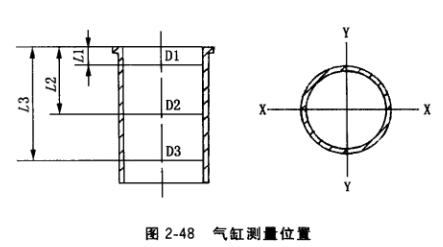 (2) 磨損情況的檢查。有條件 時(shí)可用雖缸表(內(nèi)徑百分表)進(jìn)行測(cè)量。測(cè)量一般選3個(gè)截面,如圖 2-48所示。第一個(gè)位置是活寒在上止點(diǎn)時(shí)第一道活塞環(huán)所對(duì)應(yīng)的位置 (D1處);第二個(gè)位置在氣缸中部 (D2處),相對(duì)于活塞處于上止點(diǎn)時(shí)活塞裙部所對(duì)應(yīng)的位置;第三個(gè)位置相當(dāng)于活塞處于下止點(diǎn)時(shí),最下一道活塞環(huán)所對(duì)應(yīng)的位置(D3處)。每個(gè)截面都要測(cè)量垂直于曲軸軸線(xiàn)方向(X—X)和 平行于曲軸軸線(xiàn)方向(Y-Y)的直徑。根據(jù)所測(cè)數(shù)據(jù),可算出氣缸套的圓度誤差、圓柱度誤差及最大磨損量。同一截面上兩個(gè)方向測(cè)得了直徑差之半即為該截面的圓度誤差,3個(gè)截面中最大的圓度誤差即為氣缸的圓度誤差,間一方向上(X-X或Y-Y)最大直徑與D3截面直徑差之半即為氣缸的圓柱度誤差,最大直徑與公稱(chēng)直徑差之半即為最大磨損量。各種機(jī)型內(nèi)燃機(jī)的氣缸磨損極限都有規(guī)定。通常汽油機(jī)氣缸圓度誤差超過(guò)0.05mm、圓柱度誤差超 過(guò)0.2mm;柴油機(jī)氣缸圓度誤差超過(guò)0.06mm、圓柱度誤差超過(guò)0. 25mm時(shí),氣缸套應(yīng)進(jìn) 行更換。