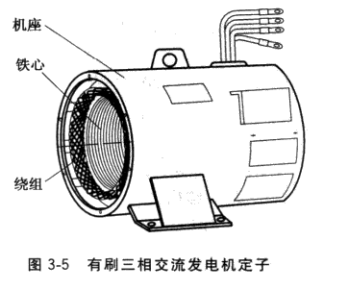 (1)定子。定子由機(jī)座、定子鐵心、定子繞組組 成,如圖3-5所示。機(jī)座是發(fā)電機(jī)的整體支架,用以固定帶繞組的定子鐵心,并和前端蓋、后端蓋及軸承一道支承轉(zhuǎn)子。新型發(fā)電機(jī)機(jī)座由鋼板壓制而成,機(jī)座內(nèi)壁有沿圓周均勻分布的若干軸向筋條,用以支撐、 固定定子鐵心。機(jī)座兩端面加工有與端蓋配合的止口及螺孔。機(jī)座下部有支撐定子及整機(jī)的底腳。機(jī)座頂 部或側(cè)面一般裝有出線盒,出線盒內(nèi)裝有接線板,從這里接出交流電輸出引線、勵(lì)磁繞組引線和定子副繞組引線。有的發(fā)電機(jī)出線盒中裝有勵(lì)磁調(diào)節(jié)器。