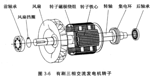(2) 轉(zhuǎn)子。轉(zhuǎn)子一般由轉(zhuǎn)軸、磁極鐵心、磁極繞組、集電環(huán)、軸承及風(fēng)扇等組成,如圖 3-6所示。