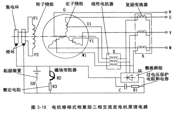 不可控電抗移相式相復(fù)勵三相交流發(fā)電機原理電路如圍3-18所示。線性電抗器接于發(fā)電機定子三相繞組抽頭U1、V1、W1。由圖可知,由定子繞組抽頭電壓經(jīng)線性電抗器提供交流側(cè)勵磁電流的電壓分量,發(fā)電機負(fù)載電流經(jīng)復(fù)勵變流器提供交流側(cè)勵磁電流的電流分量,兩者經(jīng)幾何合成,經(jīng)整流橋組整流后向發(fā)電機轉(zhuǎn)子繞組提供勵磁電流.建立轉(zhuǎn)子主磁 場。線性電抗器的作用是使由它提供的電流分量的相位移后端電壓約90電角度,由這個電流分量供給發(fā)電機空載時維持一定端電壓所需的勵磁電流。復(fù)勵變流器的作用是使由它提供 的電流分的相位與發(fā)電機負(fù)載電流相位相位相同,其數(shù)值與負(fù)栽電流呈線性關(guān)系,由它提供為補償負(fù)載時電樞反應(yīng)的去磁效應(yīng)所需的勵磁電流。
