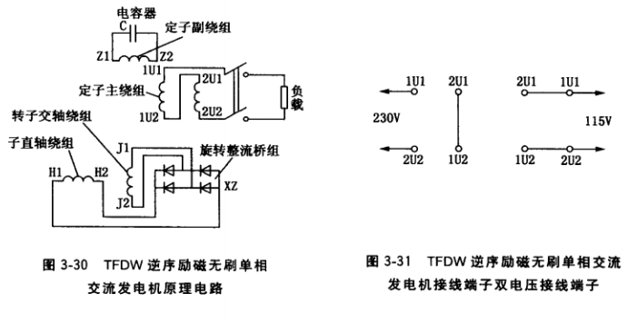 圖3-30為國(guó)產(chǎn)TFWD系列隱極式逆序勵(lì)磁無刷單相交流發(fā)電機(jī)整機(jī)原理電路圖, 圖3-31為其接線端子。該系列定子主繞組由兩個(gè)完全相同的繞組連接而成,每個(gè)繞組頭尾線端標(biāo)志分別為1U1、1U2和2U1、2U2。兩個(gè)繞組不同接法時(shí)輸出電壓可為230V或 115V:用接線片連接端子1U2、2U1時(shí),表示主繞組1尾端和主繞組2的頭端連接,此時(shí)兩個(gè)繞組串聯(lián),輸出電壓為230V;用接線片分別連接1U1、2U1, 1U2、2U2,兩個(gè)繞組頭頭連接、尾尾連接,此時(shí)兩個(gè)繞組并聯(lián),輸出電壓為115V。