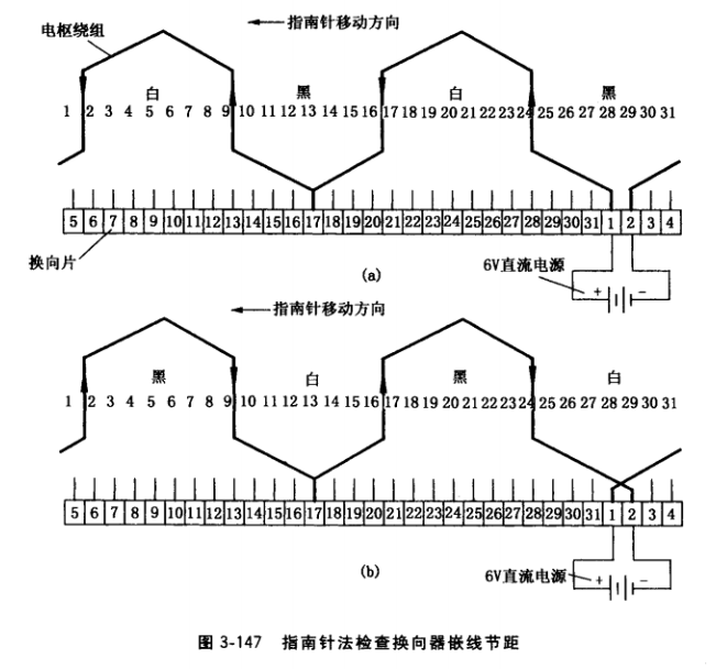 ②用指南針沿通電的繞組依次移動(dòng),觀察 指南針指向是否異常,可以判斷嵌線錯(cuò)誤。圖 3-147以換向片1、2所連接的電樞繞組為例,檢測(cè)時(shí)把電樞垂直放S臺(tái)面。圖a為IH確嵌線,在換向片1、2施加6V直流電壓,正極接片1,負(fù)極接片2,此時(shí)繞組電流方向如箭頭 所示,把指南針靠近電樞表面順時(shí)針移動(dòng)一周,磁針指向先后順序?yàn)楹凇?、黑、白。依?方法,逐個(gè)測(cè)試換向片2、3, 3、4……磁針指向均應(yīng)黑、白、黑、白。圖b中與換向片1、 2連接的電樞繞組引線嵌錯(cuò),這時(shí)電樞繞組中電流方向與圖a相反,則指南針順時(shí)針移動(dòng)一 周時(shí),磁針指向與圖a相反。說(shuō)明檢測(cè)過(guò)程中,磁針指向規(guī)律突然變反,可斷定該處繞組在 換向片上嵌反。