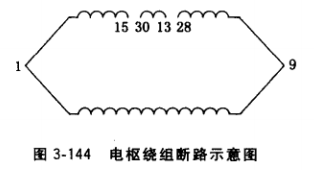 ④片15、28之間的繞組已脫離加于片1、9的電壓,可用萬(wàn)用表逐片檢査片間通、斷, 凡出現(xiàn)斷處,萬(wàn)用表表針不擺動(dòng),即查得斷線繞組。