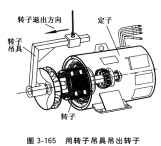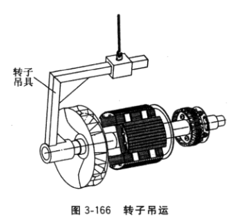 (4)退出轉(zhuǎn)子。用圖3-165所示吊具,套入轉(zhuǎn)子軸伸端,輕輕吊起轉(zhuǎn)子,沿箭頭方向緩緩?fù)顺鲛D(zhuǎn)子。不須拆彈性聯(lián)軸器或盤式柔性聯(lián)接片的發(fā)電機轉(zhuǎn)子退出法:由人工邊轉(zhuǎn)動轉(zhuǎn)子邊軸向退出轉(zhuǎn)子,當(dāng)轉(zhuǎn)子鐵心段剛露出定子機座時,用粗麻繩圈套鐵心外徑,輕輕吊起轉(zhuǎn) 子,緩緩?fù)顺鲛D(zhuǎn)子。不管采用以上哪種方法,退出轉(zhuǎn)子過程切不可碰傷定子繞組。退出轉(zhuǎn)子后如圖3-166所示,仍由吊具吊運轉(zhuǎn)子然后輕放在干凈、可靠的臺架上。