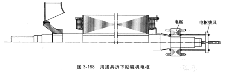(8)拔出勵磁機電樞。勵磁機電樞一般位于轉(zhuǎn)子后端,可利用電樞鐵心軛部4個通孔,裝上4根長螺桿,用圖3-168所示電樞拔具,卸下電樞。