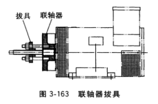 (2)拆下彈性聯(lián)軸器。按圖3-163旋入拔具軸螺桿(頂桿),輔以鐵錘錘擊螺桿頂端, 拆下彈性聯(lián)軸器。