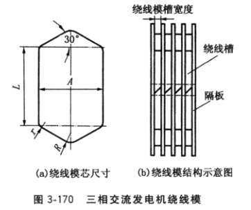 繞線模結(jié)構(gòu)見圖3-170b,繞線槽尺寸按上述計算值制作。繞線模由繞線槽和隔板組合而成,繞線槽數(shù)=q×連繞線圈組數(shù)(q為每個線圈組槽數(shù))。修理發(fā)電機用的繞線模宜就地取材用木板加工而成。繞線模中央開有方孔,方孔尺寸應(yīng)與繞線機上的方形軸尺寸相符。