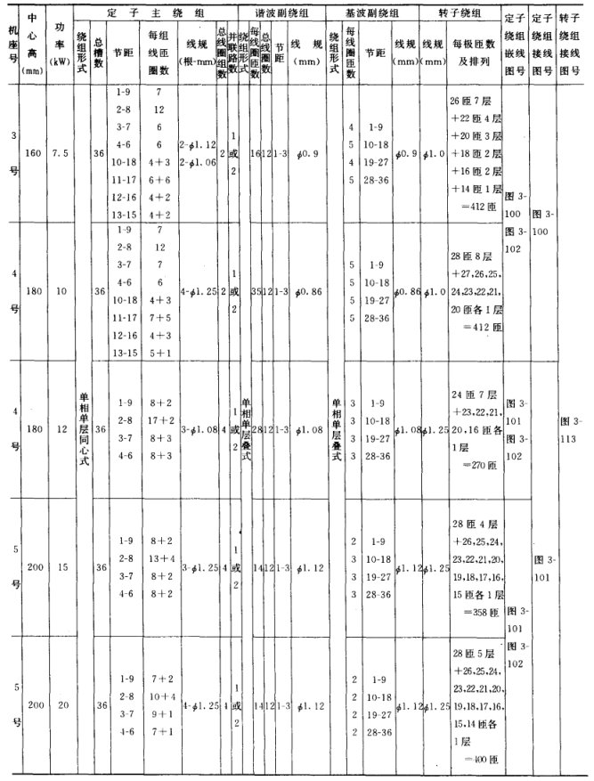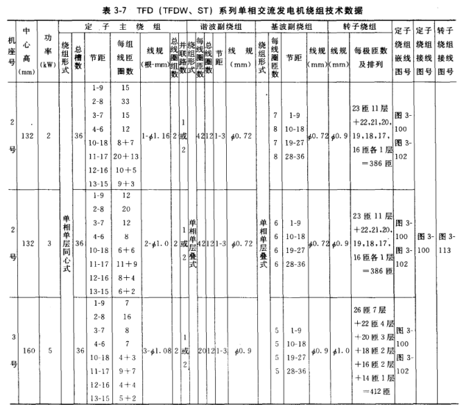 單相交流發(fā)電機(jī)定子繞組一般為單層同心式,繞組一般采用漆包圓銅線繞制。修理時(shí)根據(jù)交流發(fā)電機(jī)的型號(hào)、規(guī)格,從相應(yīng)的表3-7、表3-8中査找或采用實(shí)測(cè)法確定線規(guī),實(shí)測(cè)方法同三相交流發(fā)電機(jī)。每相線圈組數(shù)等于發(fā)電機(jī)極數(shù)。每個(gè)線圈匝數(shù)、每極繞組槽數(shù)q、 每次連繞線圈組數(shù)的確定同三相交流發(fā)電機(jī)。單相交流發(fā)電機(jī)繞組為同心式,修理時(shí)必須拆出一個(gè)線圈組,認(rèn)真清點(diǎn)該線圈組中各線圈始邊和末邊所在的槽位,以確定節(jié)距,如1-9,2-8、3-7。