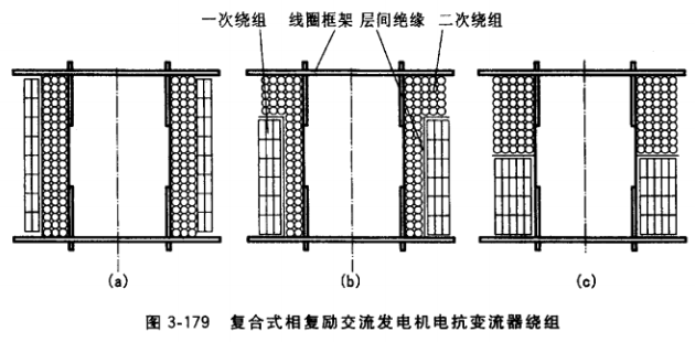 電抗移相式相復(fù)勵交流發(fā)電機線性電抗器、雙繞組電抗分流交流發(fā)電機電抗器主要由線圈框架、繞組等組成,其繞組剖視圖如圖3-178所示。三相電抗變流復(fù)合式相復(fù)勵交流發(fā)電機電抗變流器及單相相復(fù)勵交流發(fā)電機電抗變流器主要由線圈框架、一次繞組、二次繞組等組成。發(fā)電機運行時一次繞組通過的電流大,故一般采用漆包扁銅線或雙玻璃絲包扁銅線繞制。二次繞組通過的電流小,一般采用漆包圓銅線繞制。出于對線圈框架空間的有效利用,一次繞組和二次繞組排列有3種形式,見圖3-179。