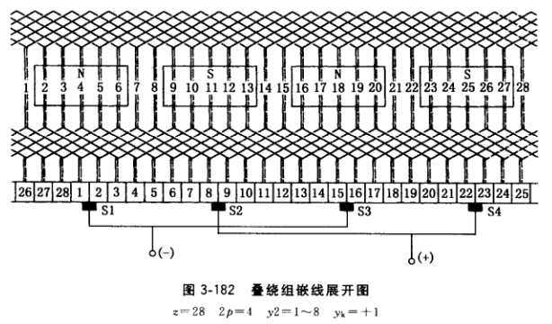 圖3-182是單疊繞組的應用實例,發(fā)電機極數(shù)為4極,電樞為28槽,換向器節(jié)距yk=±l,繞組槽節(jié)距y2 = z/2p±?= 28/4 = 7 (這里 ?= 0,為整距 1-8)。