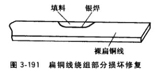 單獨(dú)修理的換向極繞組都采用手工繞制。由于過(guò)熱燒壞的繞組,只要更換匝問(wèn)絕緣材料,重新浸漆處理即可。匝間短路或嚴(yán)重?fù)p壞的繞組,亦可采用局部修復(fù)的方法修復(fù):損壞部分不超過(guò)導(dǎo)線截面積的1/5時(shí),可用銀焊或銅焊補(bǔ)滿損壞部分;繞組某部分損壞面積達(dá) 1/3時(shí),可用銅焊填充或以相當(dāng)大小的銅塊填充并用銀焊條焊牢,如圖3-191所示。繞組部分損壞面積超過(guò)1/3時(shí),則要切除損壞部分,重繞幾匝新線,用銀焊焊接起來(lái)。銅線接頭應(yīng) 在繞組直線邊上,不可連接在圓弧處,接頭處應(yīng)互成45°左右的斜角,如圖3-192所示。繞組大面積損壞則須更換繞組。