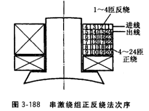 (2)絕緣扁導(dǎo)線繞制。一般可利用并激繞組的繞線模繞制。把繞線模裝到繞線機(jī)上,使計(jì)數(shù)表回零。根據(jù)所繞匝數(shù)設(shè)定串激繞組層數(shù)及每層匝數(shù)。為使串激繞組出線頭引出、連接方便,不發(fā)生短路,要求繞組的底、面線引線都處于繞組外層表面,為此一般采用正、反繞繞線法,如圖3-188所示。例如,某一串激繞組共24匝,分繞4層,每層6匝,繞第一層時(shí)先按4匝的總長(zhǎng)取出來(lái)反繞到線模上,扎住線頭,然后繼續(xù)順繞第一層5?9匝,第二層10?14匝,第三層15?19匝,第四層20?24匝。