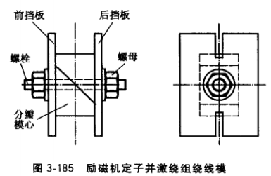 (1)繞線模。繞線模由模芯和擋板組成,兩瓣模芯各固定在前后擋板后,靠螺栓緊固而成,如圖3-185所示。繞線模芯尺寸可根據(jù)原來(lái)繞組的尺寸或直接測(cè)量磁極鐵心尺寸而定,考慮到鐵心極身絕緣厚度及裝配間隙,模芯長(zhǎng)、寬方向尺寸應(yīng)比磁極鐵心大,表3-39為確定繞線模模芯與鐵心尺寸關(guān)系的經(jīng)驗(yàn)數(shù)據(jù)。