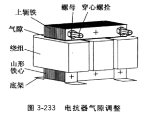 ①松開電抗器或電抗變流器(見圖3-233、圖3-234)穿心螺栓、螺母,提髙上軛鐵, 在氣隙熱入所需厚度的絕緣依片,再往下壓緊上軛鐵,鎖緊螺母。墊入氣隙中的墊片厚度以 保證發(fā)電機(jī)電壓不低于1. 05倍額定值為準(zhǔn)。