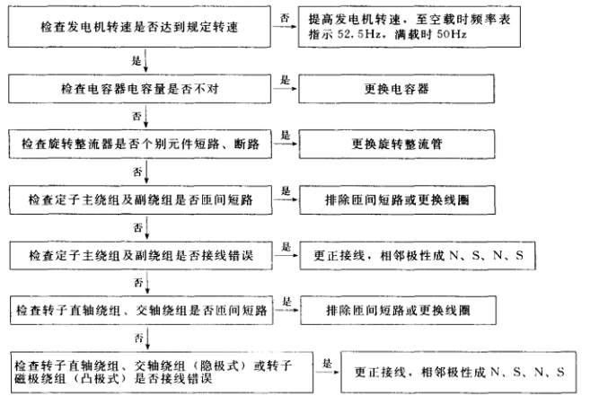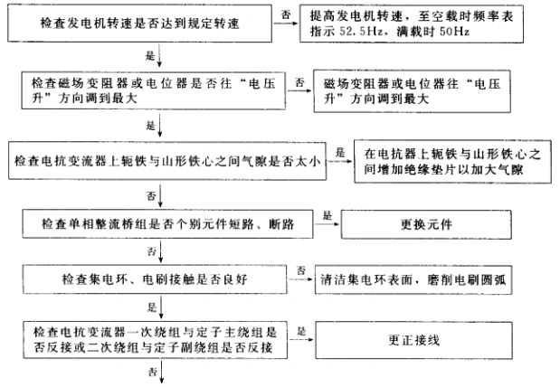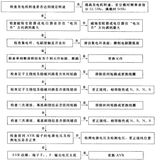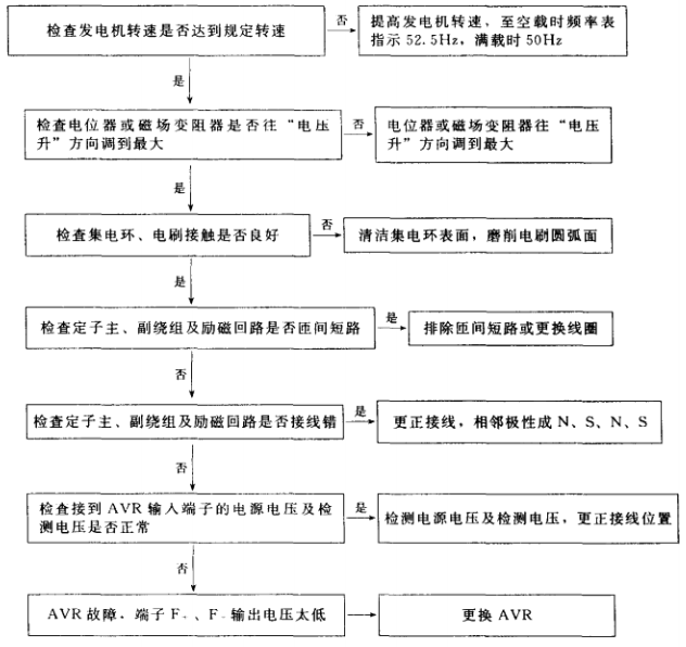 1.有刷單相交流發(fā)電機(jī)(含可控勵(lì)磁)電壓太低故障排除步驟