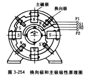 ④在直流勵(lì)磁機(jī)中,順著電樞方向看,換向極的 極性應(yīng)該和下面一個(gè)主磁極(即后切割電樞繞組的磁 極)相同,如圖3-254所示。對(duì)此,可用指南針在定子內(nèi)圓周順著電樞旋轉(zhuǎn)方向移動(dòng)以檢査換向極和主極 剩磁極性、位置,正確時(shí)應(yīng)呈N、N, S、S,N、N,S、S,若不符合這順序,應(yīng)對(duì)調(diào)主極兩引線在接線盒 的接線位置。