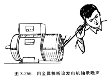 (1)故障現(xiàn)象。滾動(dòng)軸承由于其可靠性 高、維護(hù)方便和承載能力大,而被廣泛應(yīng)用 于小型發(fā)電機(jī),但軸承運(yùn)轉(zhuǎn)噪聲常成為小型 發(fā)電機(jī)的主要哚聲源。軸承噪聲從軸承室傳 出,呈金屬滾動(dòng)摩擦聲。用金屬棒一端接觸 發(fā)電機(jī)軸承蓋,耳朵緊貼金屬棒另一端聽診 (見圖3-256),可清晰地辨認(rèn)出軸承噪聲。