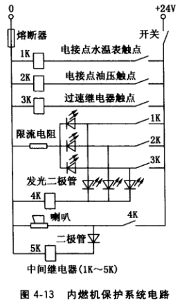 (1) 內(nèi)燃機(jī)保護(hù)系統(tǒng)。有高水溫、低油壓和超速保 護(hù),典型電路如圖4-13所示(有的內(nèi)燃機(jī)還有欠速、冷 卻水中斷、油溫高、燃油油面低、并列機(jī)組逆功率保護(hù) 等)。機(jī)組運(yùn)行中,一旦內(nèi)燃機(jī)出現(xiàn)高水溫、低油壓和超 速時(shí),電接點(diǎn)水溫表觸點(diǎn)、電接點(diǎn)油壓表觸點(diǎn)和過速繼 電器觸點(diǎn)閉合,繼電器1K、2K、3K得電動(dòng)作,使其常開觸點(diǎn)閉合,一方面使發(fā)光二極管發(fā)出光報(bào)警信號(hào),另 —方面使繼電器4K動(dòng)作,喇叭發(fā)出聲報(bào)警信號(hào),同時(shí)繼電器5K動(dòng)作,機(jī)組立即自動(dòng)停機(jī),起到了保護(hù)作用。 有的內(nèi)燃機(jī)設(shè)水溫表和油壓表,用于監(jiān)控其工作時(shí)的水溫和油壓。