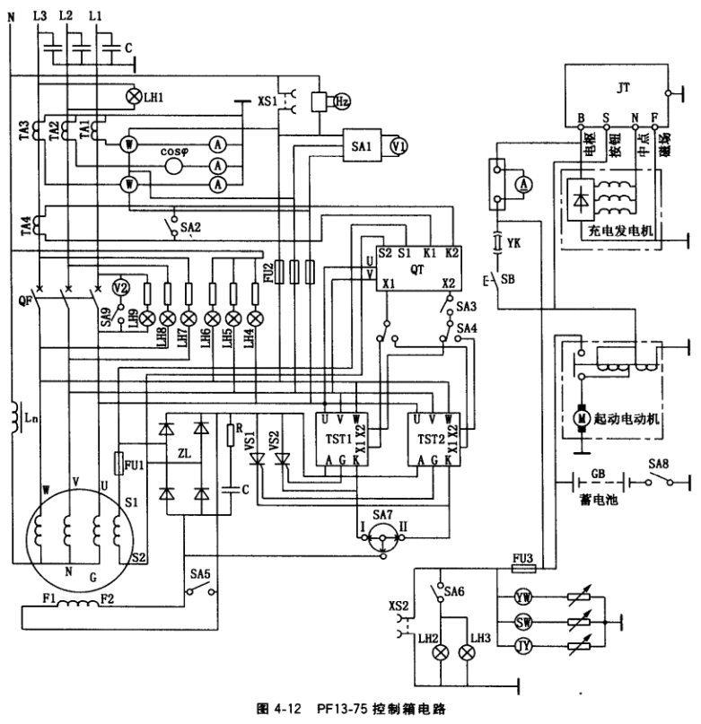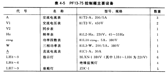 (3)并列運(yùn)行的小型三相發(fā)電機(jī)控制箱電路。圖4-12為PF13-75發(fā)電機(jī)控制箱電路, 主要增加了并列運(yùn)行部分和監(jiān)視儀表,其主要元器件型號(hào)、規(guī)格見表4-5。