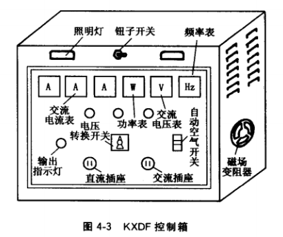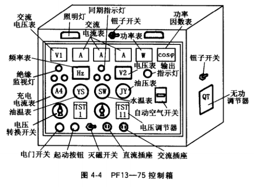 發(fā)電機(jī)組控制箱主要用于移動(dòng) 式或容量較小的發(fā)電機(jī)的控制、測(cè) 量、保護(hù)和送配電,一般為封閉式 金屬結(jié)構(gòu),用優(yōu)質(zhì)鋼板沖壓、焊接而成。它經(jīng)減震器安裝在發(fā)電機(jī)背上,與發(fā)電機(jī)組成一體。圖4-3為 KXDF發(fā)電機(jī)控制箱,面板上裝有 電流表、電壓表、頻率表、功率表、按鈕、指不燈和自動(dòng)空氣斷路器(空氣開關(guān))的操作機(jī)構(gòu),可方便地監(jiān)測(cè)發(fā)電機(jī)運(yùn)行情況并進(jìn)行操作??刂葡鋫?cè)面還裝有磁場(chǎng)變阻器,供調(diào)節(jié)發(fā)電機(jī)電壓或無功??刂葡涿姘迳显O(shè)置儀表的多少隨發(fā)電機(jī)的容量不同和用戶要求不同而不同。有的沒有功率表,有的只裝電流表和電壓表、頻率表,最簡(jiǎn)單的只裝一只電壓表。發(fā)電機(jī)的勵(lì)磁方式不同, 用于調(diào)節(jié)發(fā)電機(jī)電壓的設(shè)備也不同,除上述 用的磁場(chǎng)變阻器外,有的用電抗器,電壓調(diào) 整率高的則用自動(dòng)勵(lì)磁調(diào)節(jié)器(AVR)。