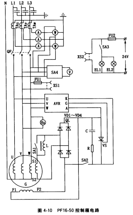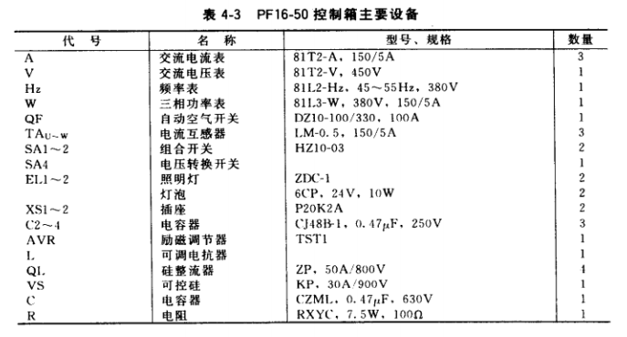 各廠家發(fā)電機(jī)組控制箱電路圖一般大同小異,不同之處主要在于勵(lì)磁系統(tǒng)及裝設(shè)的電工儀表的多少。圖4-10、圖4-11分別為PF16-50、XFK-13控制箱電路,其主要元器件分別見 表4-3和表4-4。