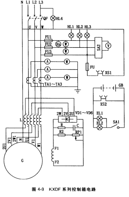 (2)單機(jī)運(yùn)行的小型三相發(fā)電機(jī)組控制箱電路。圖4-9為KXDF 系列低壓發(fā)電機(jī)控制箱電路,其主 要元器件型號(hào)、規(guī)格見表4-2,其中 三相交流電主要經(jīng)過自動(dòng)空氣開關(guān)QF接至接線柱(容量較大的則直接由QF輸出端引出)輸出,另外還有220V交流插座 XS1和24V直流插座XS2。直流插座和照明燈由蓄電池供電。為了監(jiān)測(cè)發(fā)電機(jī)的絕緣情況, 配有3只絕緣指示燈(HL1?HL3)。從圖中可看出,發(fā)電機(jī)采用電抗變流復(fù)合式相復(fù)勵(lì)勵(lì) 磁。發(fā)電機(jī)電壓和由裝在控制箱內(nèi)的磁場(chǎng)變阻器RP1進(jìn)行調(diào)節(jié)。另外有6只電工測(cè)童儀表 (3只電流表、1只電壓表、1只頻率表、1只功率表)用于監(jiān)測(cè)發(fā)電機(jī)的運(yùn)行。