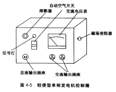 (1)輕便型單相發(fā)電機(jī)組控制箱電路。 圖4-6為國(guó)產(chǎn)單相發(fā)電機(jī)控制箱電路圖,一般有熔斷器、交流插座和電壓表、 送電信號(hào)燈,通常設(shè)有直流插座及 磁場(chǎng)變阻器。若發(fā)電機(jī)勵(lì)磁采用負(fù) 序磁場(chǎng)無刷勵(lì)磁,就不裝磁場(chǎng)變 阻器。