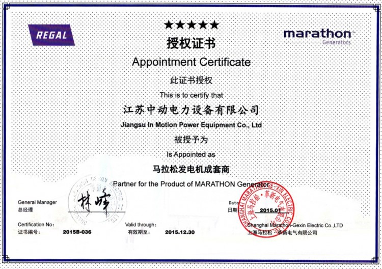 上海馬拉松革新電氣有限公司授權(quán)江蘇中動電力設(shè)備有限公司作為發(fā)電機配套商